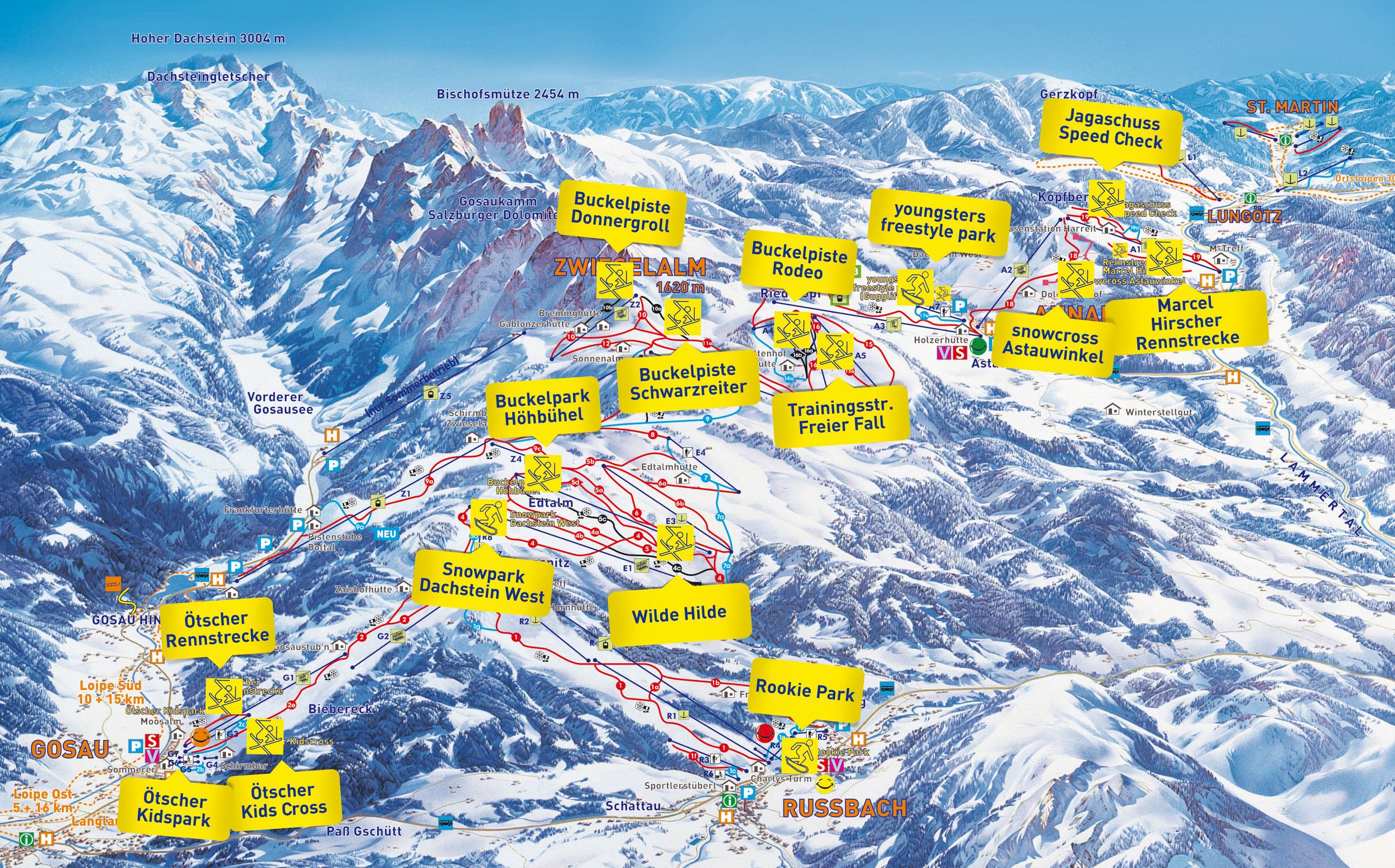 | Becsatlakozás | Gosau Hintertal: Panorama Jet Zwieselalm kabinos felvonó Gosau Mittertal: Hornspitzbahn 6 üléses felvonó Russbach: Hornbahn kabinos felvonó Annaberg im Lammertal: Kopfbergbahn 4 üléses felvonó |